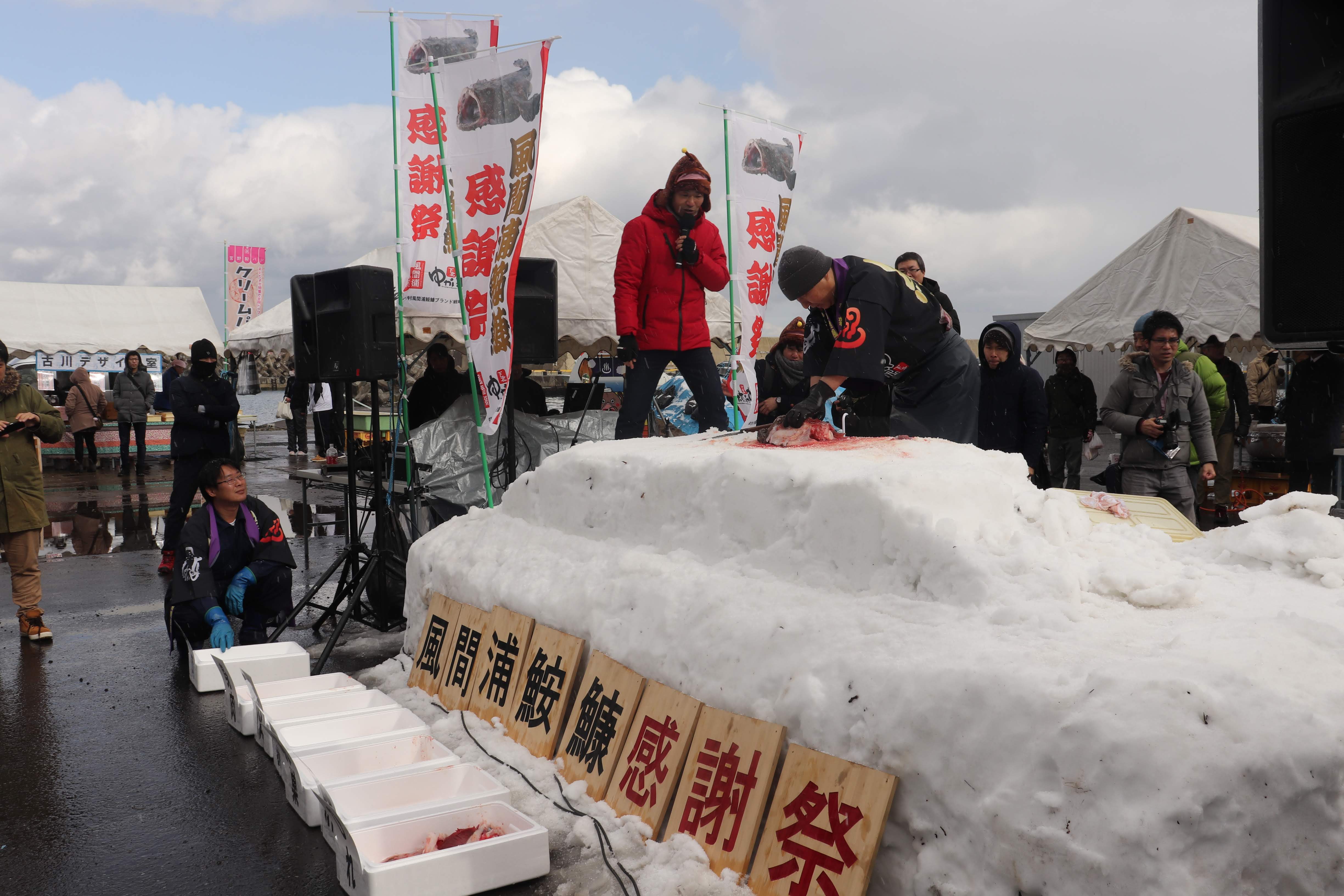 イベント会場では、鮟鱇鮨や鮟鱇汁を食べることが出来ます。その他、鮟鱇の雪中切りの実演や生きた鮟鱇を水槽で見ることが出来たりと、鮟鱇づくしの1日を過ごすことができます!
