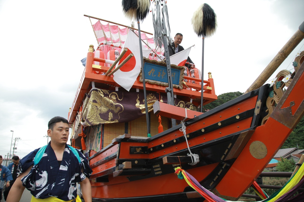 「ヤレヤレヤレー」の威勢のよい掛け声とともに、襦袢姿の若者達 が引く船山車が、町内を練り歩きます。
