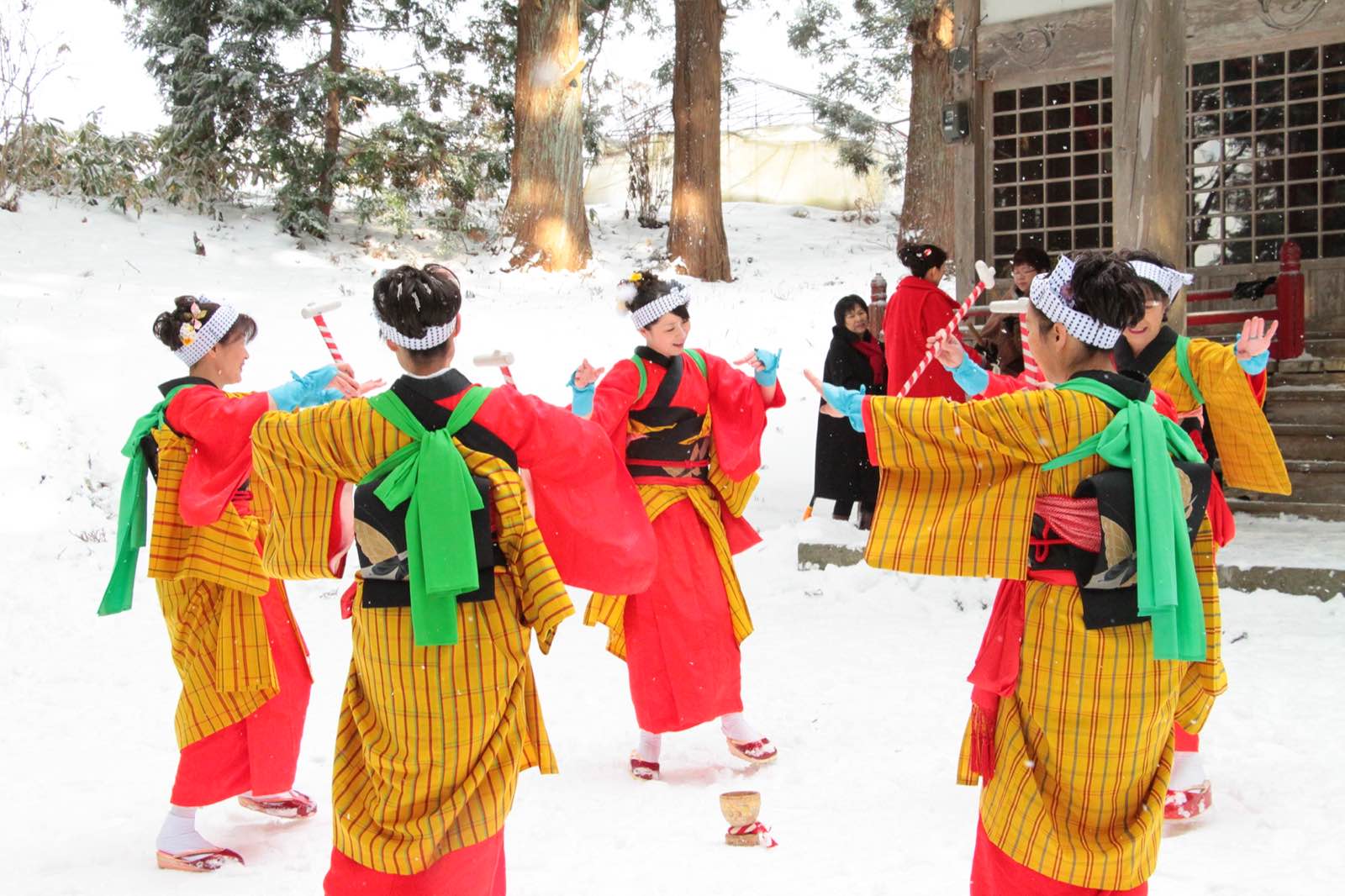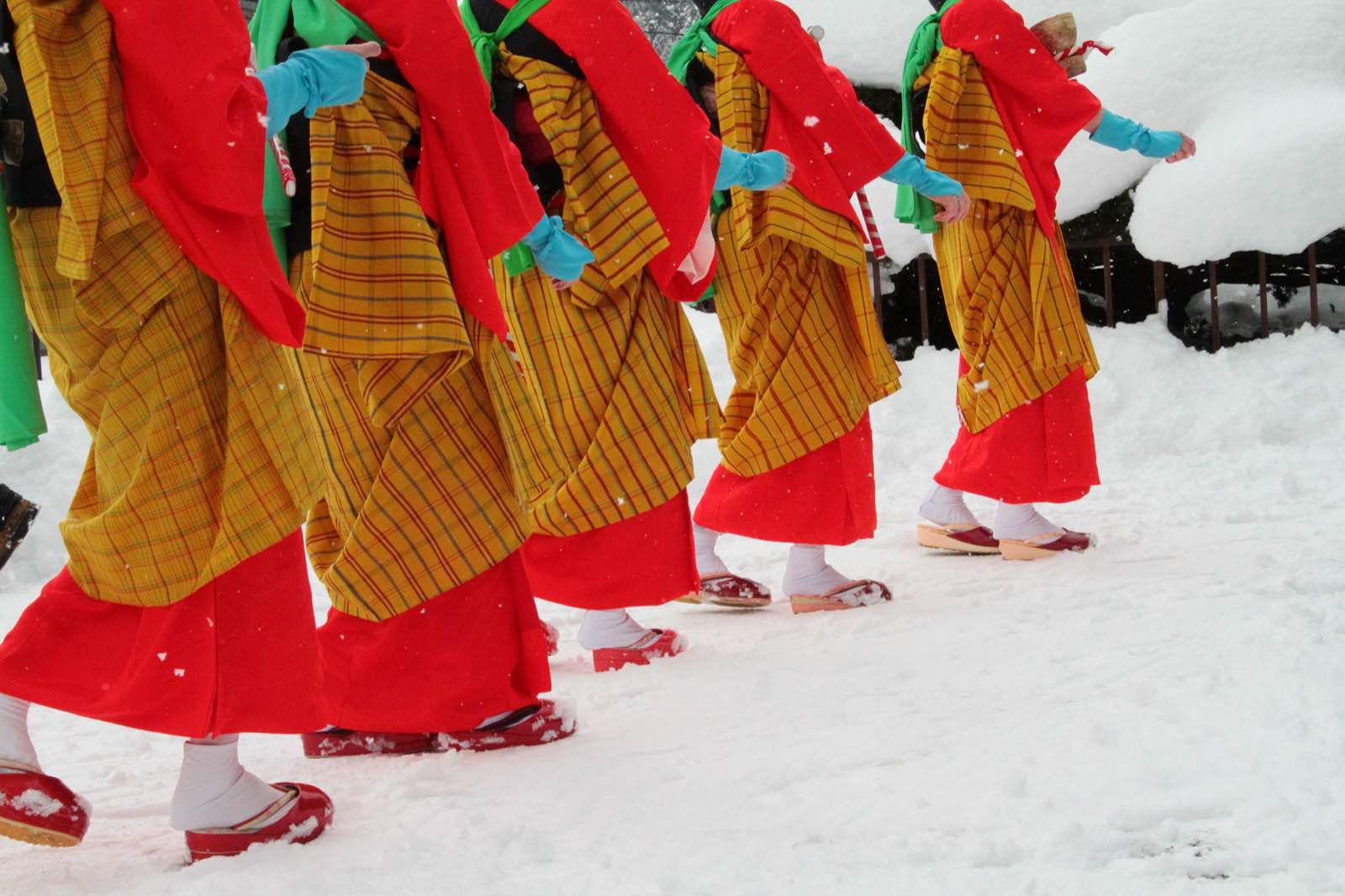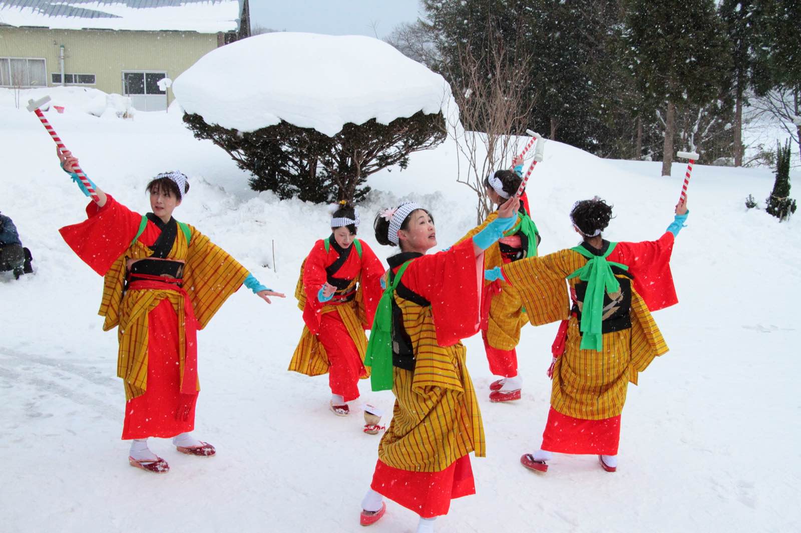 200年以上伝わるとされる小正月行事。 色鮮やかな衣装をまとった女性たちが豊作や家内安全を祈り、集落内の各戸を訪れて田植え歌や餅つき踊りを披露します。 真っ白な雪の上に舞う姿には、能舞や獅子舞・神楽とも違う、女性ならではの優しさや祈りが感じられます。