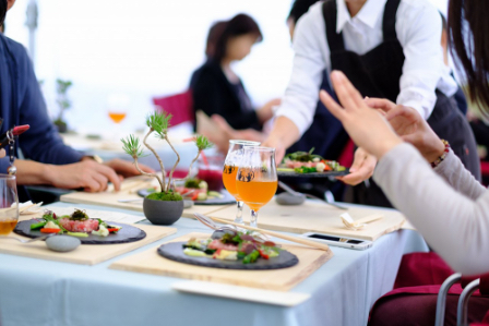 『東寿し』板長 柿本泰平氏率いるシェフチームが、「大間産本鮪」や「風間浦産雲丹」など、下北半島の食材をふんだんに使ったレシピを考案。漁火が見えるロケーションの中、コース仕立ての創作料理が提供されました。