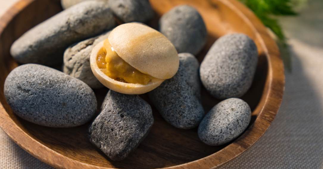 佐井村産の生うにを贅沢にピューレにしたものと、アーモンドミルクで作ったペースト、青森県産のりんごのジャムをパリパリの最中で挟んだジオダイニングを代表する一口前菜です。海岸の岩を敷き詰めたお皿は、津軽海峡をイメージしています。