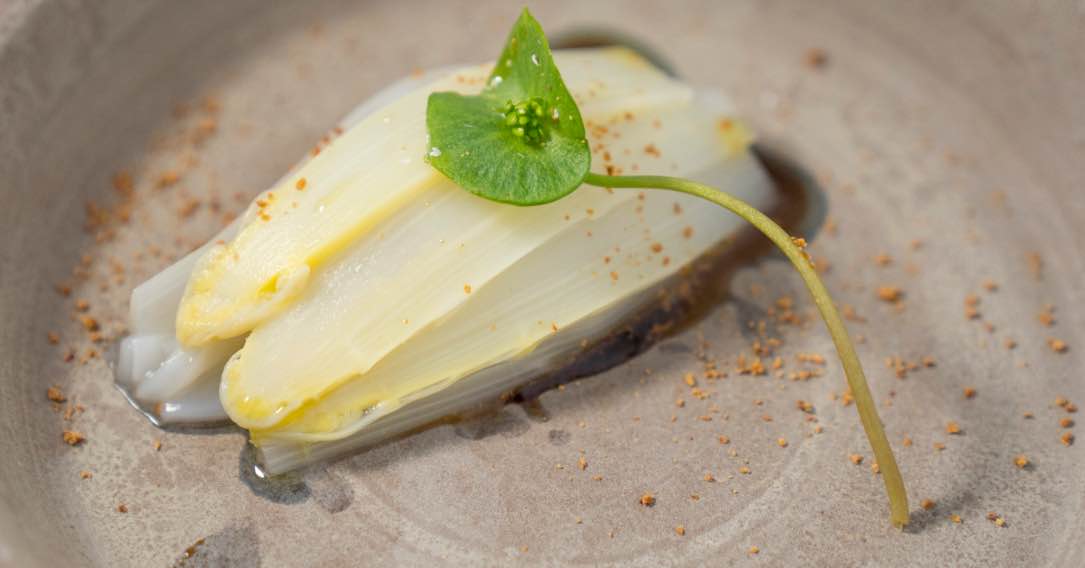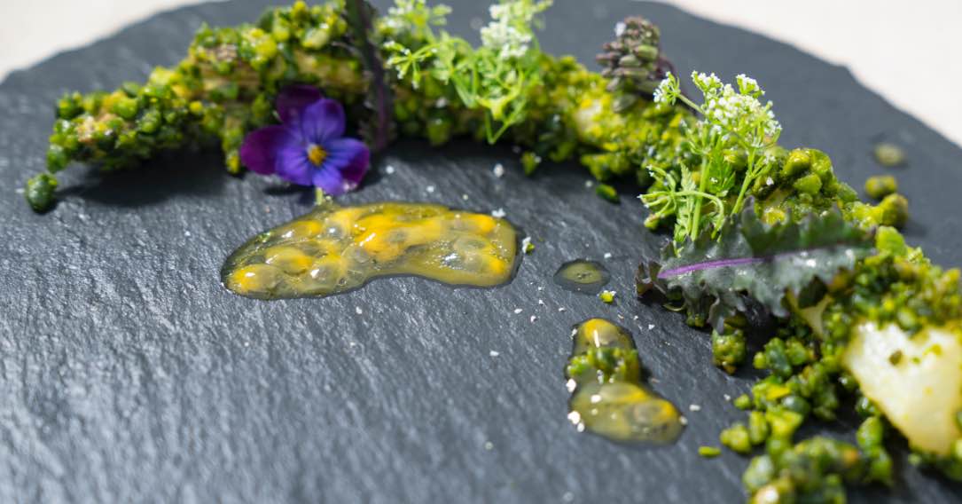 春一番に獲れる山菜山ウドを軟らかく煮たものに、生ウニで作ったウニマヨネーズをからめ、ピスタチオをまぶしました。春を連想させる、パッションフルーツのソースとエディブルフラワーを添えています。