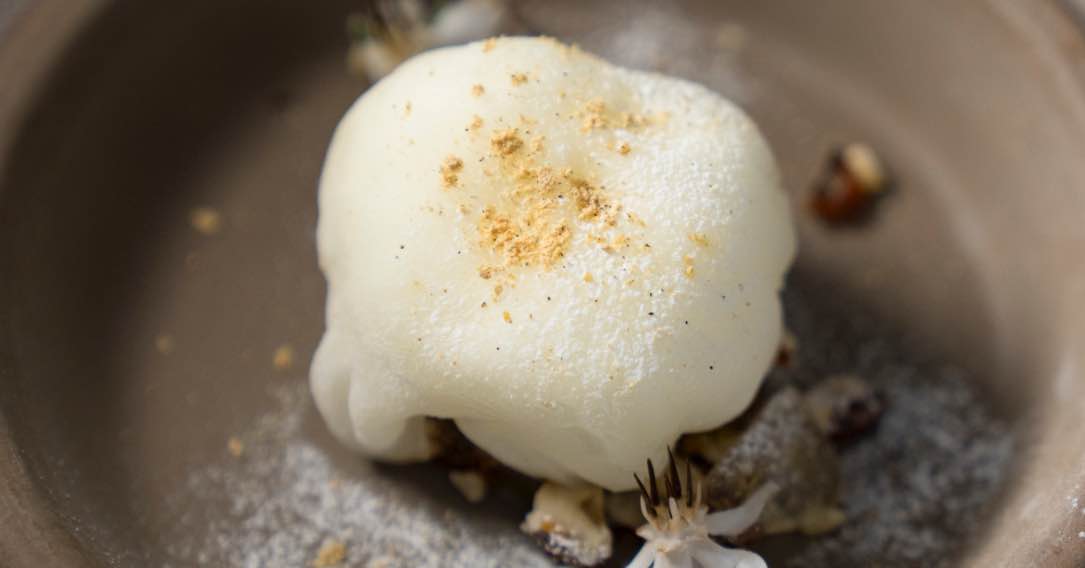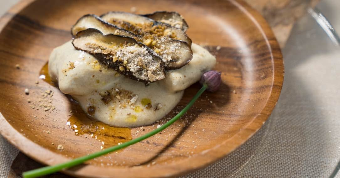 大間産おこっぺいものニョッキを、濃厚な生ウニのクリームソースでからめた一品です。低温のオーブンでカリカリに焼いたシイタケと乾燥シイタケのパウダーでトッピングしています。