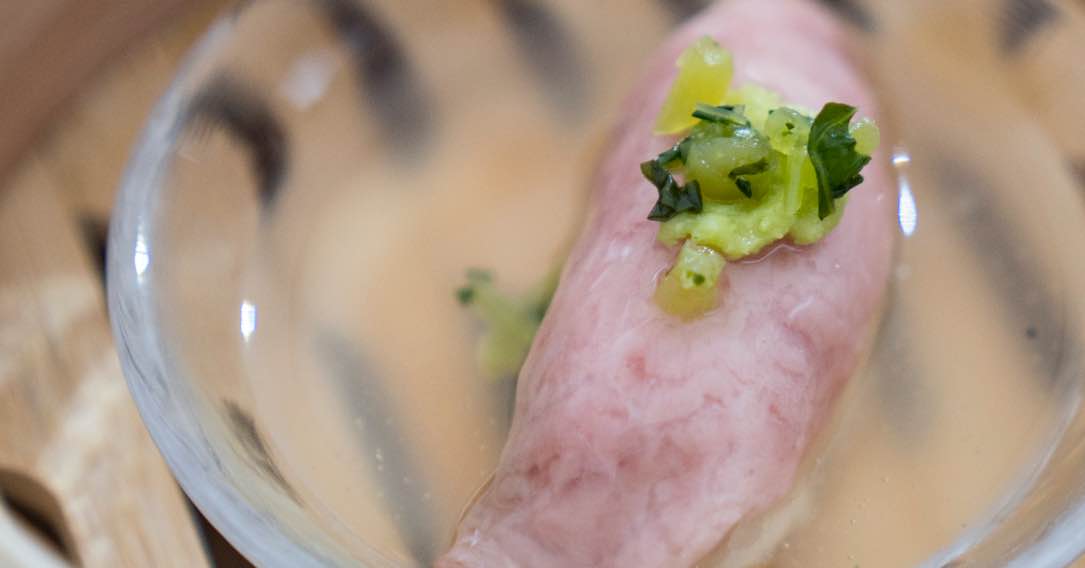 脂の乗った津軽海峡の本マグロのお寿司を、尻屋産の昆布の出汁あんといっしょに蒸し、マグロのうまみを引き出しています。