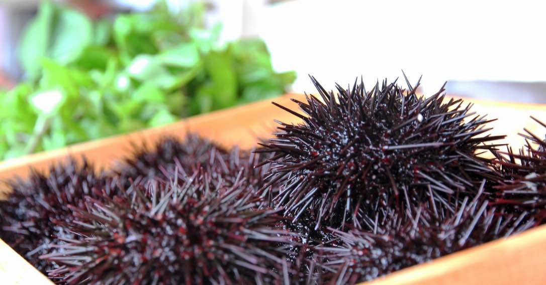見た目もウニのような真っ黒なコロッケです。イカスミパンのパン粉をまぶした中には、濃厚なウニとアーモンドのクリームが。パリパリに乾燥したふのりとヨーグルトとゆず胡椒のソースで召し上がって頂きました。