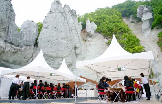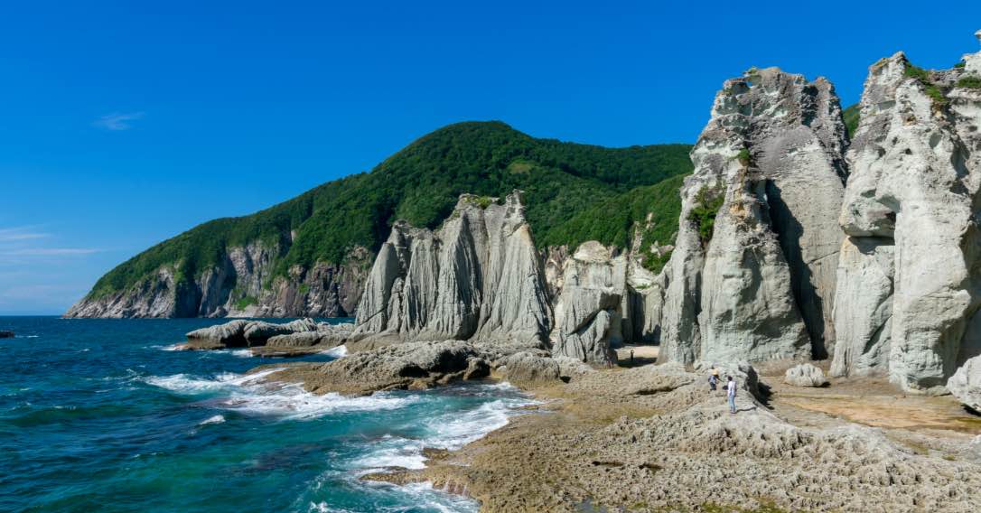 佐井村にある秘境「仏ヶ浦」には巨岩・奇岩が並び、極楽浄土を思わせる神秘的な景色が広がります。国の名勝および天然記念物にも指定されています。高さ100m近い白緑色の凝灰角礫岩が約2kmにわたって連なり、それぞれに仏にちなんだ名前が付けられています。