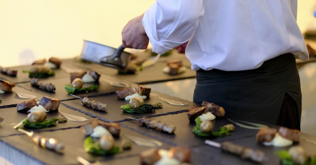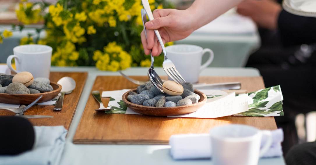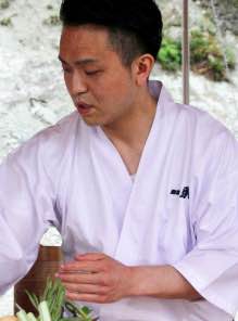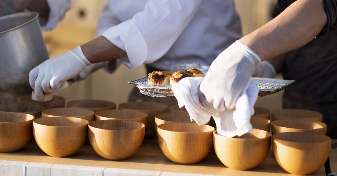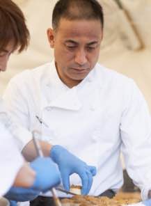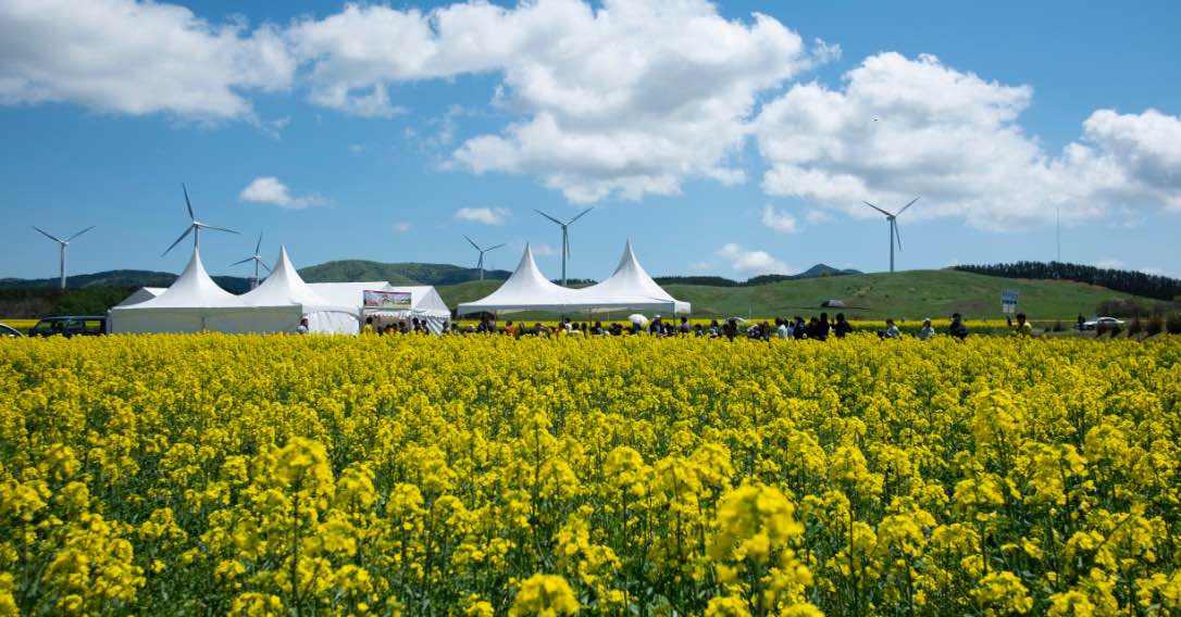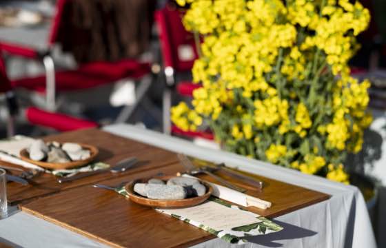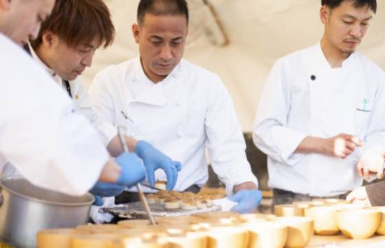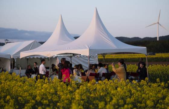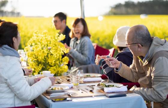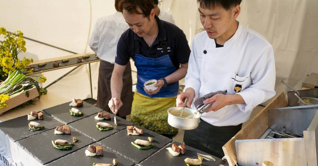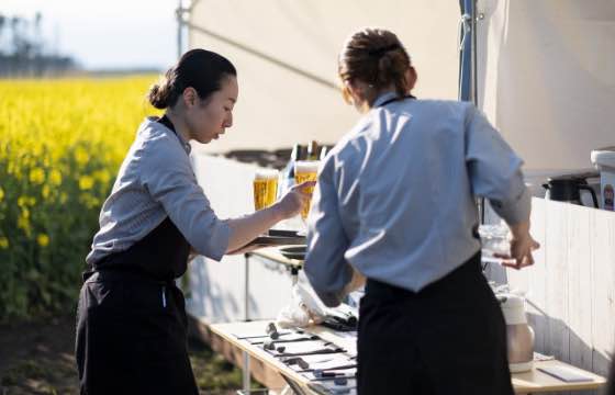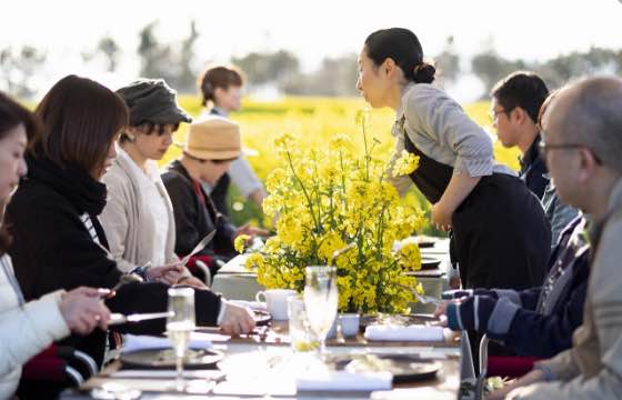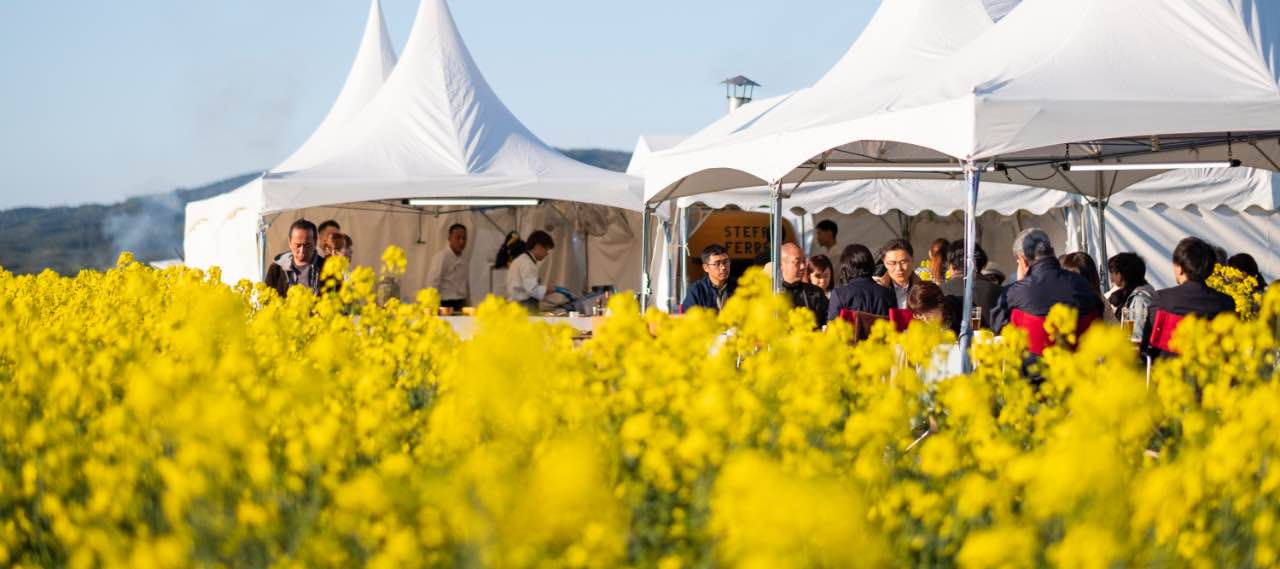 今回の会場となった、横浜町の菜の花畑は日本最大級の作付面積を誇ります。陽が傾き始めると、菜の花が夕日に照らされて金色に輝く、そんな絶景の中で、下北半島の食材を使ったオリジナルのコース料理をシェフの丁寧な解説付きでお楽しみ頂きました。