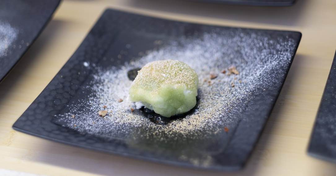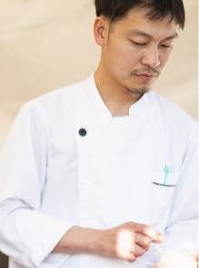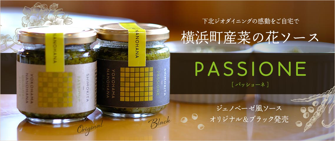 ジオダイニングのメインデザートで、下北の祭事に欠かせない料理けいらんから発想した「けいらんダンジュ」に、菜の花で春の彩りを添えました。