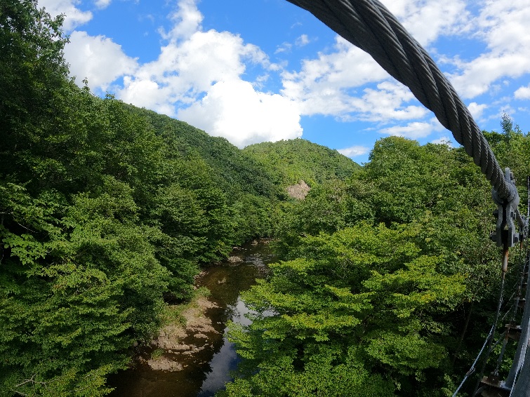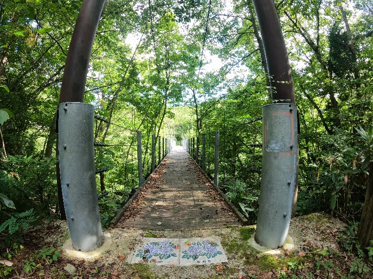 さて、遊歩道を上流に向かって進んでいくと吊り橋が見えてくる。川内川渓流の遊歩道には大きな橋が3つ架かっており、それぞれ「あじさい橋」、「セキレイ橋」、「あすなろ橋」という名前が付いている。橋の名前はそれぞれ、旧川内町の町の花、鳥(ハクセキレイ)、木(ヒノキアスナロ=ヒバ)が由来であり、3つの橋はそれぞれ種類も異なっている。