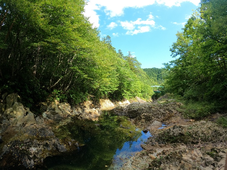 今回紹介するのは、川内川渓流。川内町中心部から10分ほど車を走らせ、川内町の工芸品である「宇賀焼」を作るむつ市陶芸センターの前から遊歩道の散策をスタートしよう。