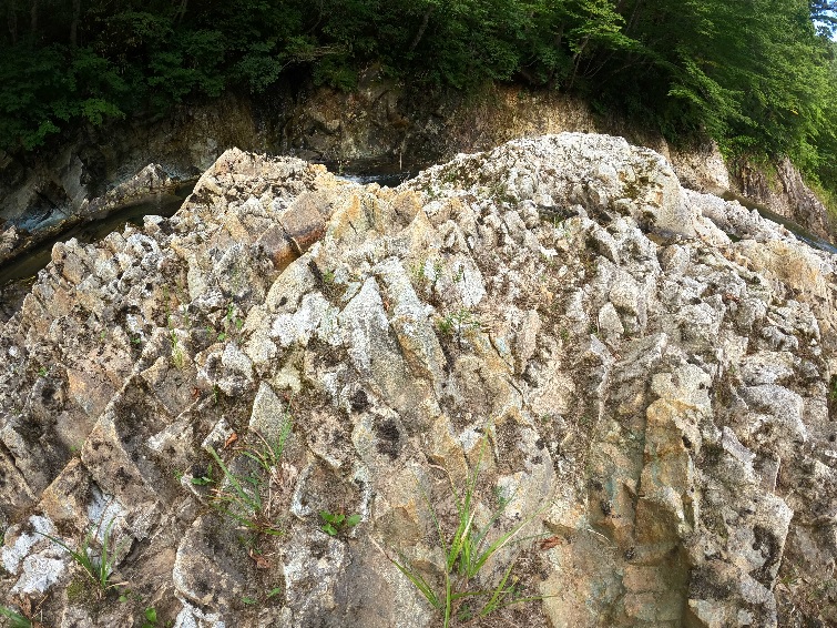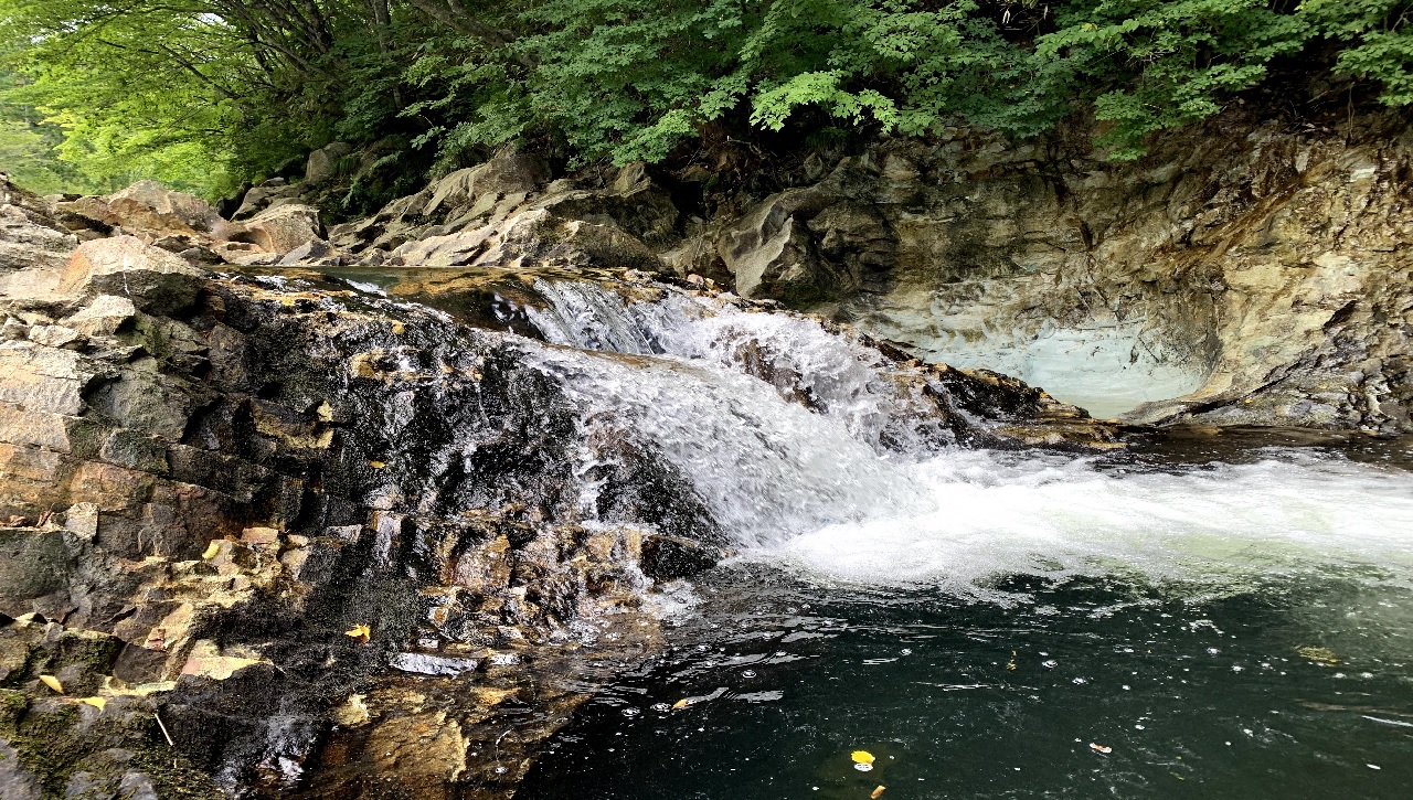 さらに先に進んでいくと、川内川渓流一番の見どころである大滝を、セキレイ橋の上から見ることができる。ガイドブックに載っている大滝の写真はこの橋の上から撮影したものがほとんどだが、遊歩道をさらに進み、気を付けて土手を下りれば、川岸まで近づくことができる。ここでは溶岩が冷え固まってできた「柱状節理」の構造をもつ岩がよく見える。そして何よりも川のせせらぎの音を聴きながら、ゆったりした時間を過ごすことができるので、私のお気に入りの場所である。