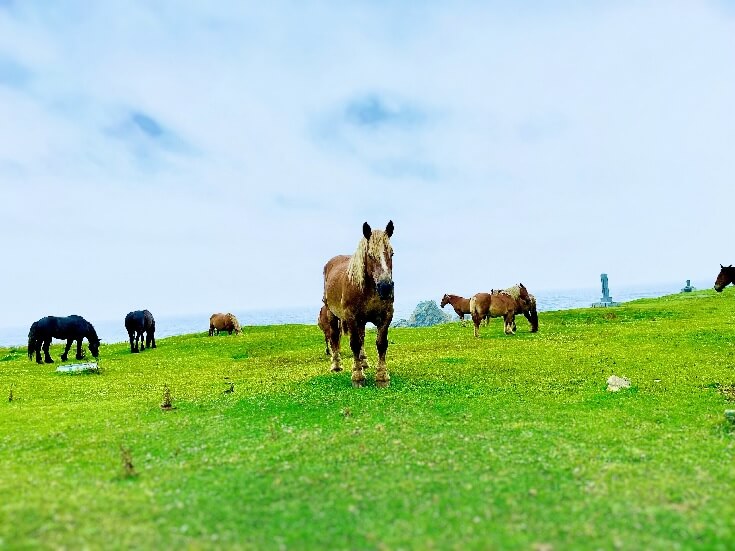 寒立馬と会えるのは何も冬だけではない。周年放牧されているので雪が溶ければ尻屋崎灯台の周りで草を食む姿を見ることもできる。灯台や広大な自然との共演は圧巻だ。きっと訪れた人々を魅了するだろう。
