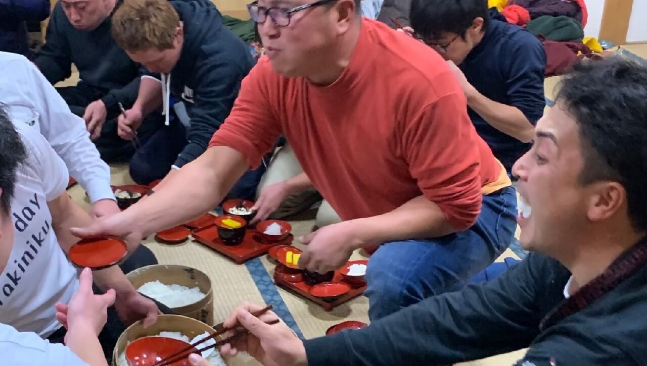 車座になった男性らの前に運ばれるのは、白米と豆腐のすまし汁、ゼンマイの辛し和え、たくあんの4品を載せたお膳だ。当番の男性の「それでは皆さん、お箸をお取りください」との声を合図に、男性らはものすごい勢いでご飯をかっ込み、「めぇしぃ~!めぇしぃ~っ!!!」と大絶叫。箸で椀をたたき、お代わりを催促してはご飯を食べまくる。しまいには額に汗をにじませ、顔を真っ赤にしながらも食べては叫び、叫んでは食べる。いつしか神社はにぎやかな笑い声に包まれる。