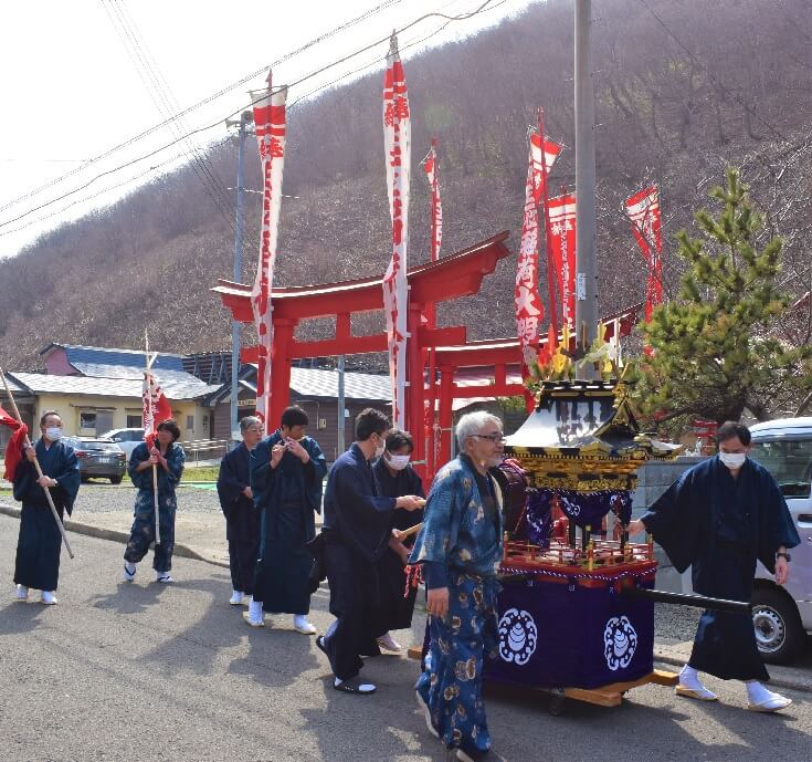 牛滝地区の隣の集落・福浦地区では130年以上に渡って漁師らが全国でも珍しい漁村歌舞伎「福浦の歌舞伎」を伝承してきた。例年、4月10日の福浦稲荷神社春祭りに合わせて上演してきたが、コロナ禍で3年連続で歌舞伎は休止となった。だが、今年は稲荷神社を中心に神事や神楽が行われ、地区の人々が大漁や地区の安全を祈っていた。