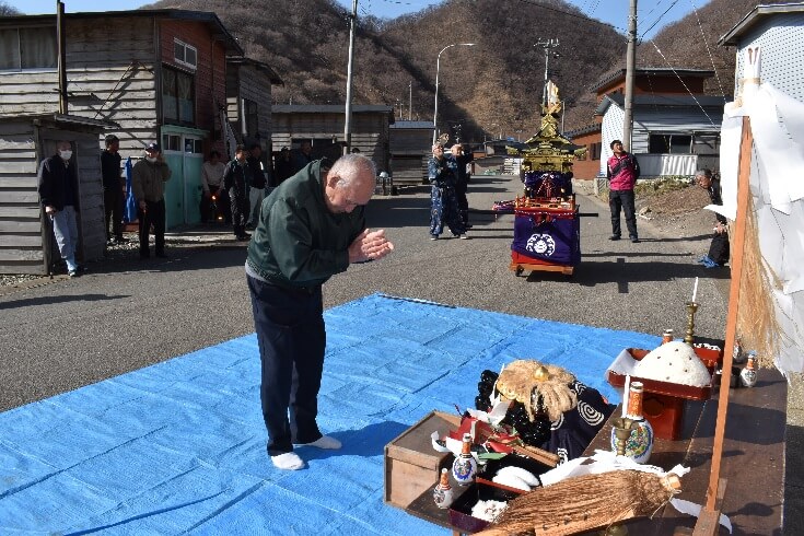 じつは4月10日のたった5日前にも、福浦漁港の近くで神楽を舞い、祈る人々の姿があった。小高い山に佇む赤い鳥居とその先にある祠は、恵比須様を祭っているそうで、毎年4月5日に神楽を奉納するという。4月10日はこれまで何度か取材したことがあったが、恵比須様は今回初めて知り、下北のディープさに改めて驚いた。