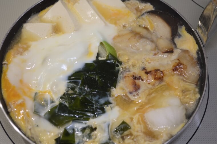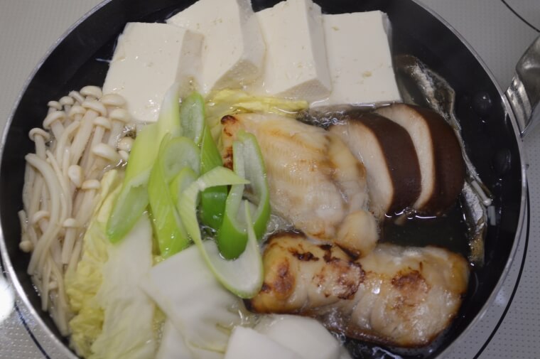 定番の具材としては、豆腐、ネギの斜め薄切り、シイタケ・エノキ等のキノコ類、白菜のそぎ切りなどが挙げられますが、その他の海藻・魚介は、季節感や色彩を出すものとして、自由に選んでいただいて構いません。下北らしさがあるのは、海藻ならワカメ、マツモ、アオサ、フノリ、イワノリなど。魚介であれば、ホタテやアブラツノザメ、カレイの焼いたもの。豪華にウニを入れても美味しくできます。