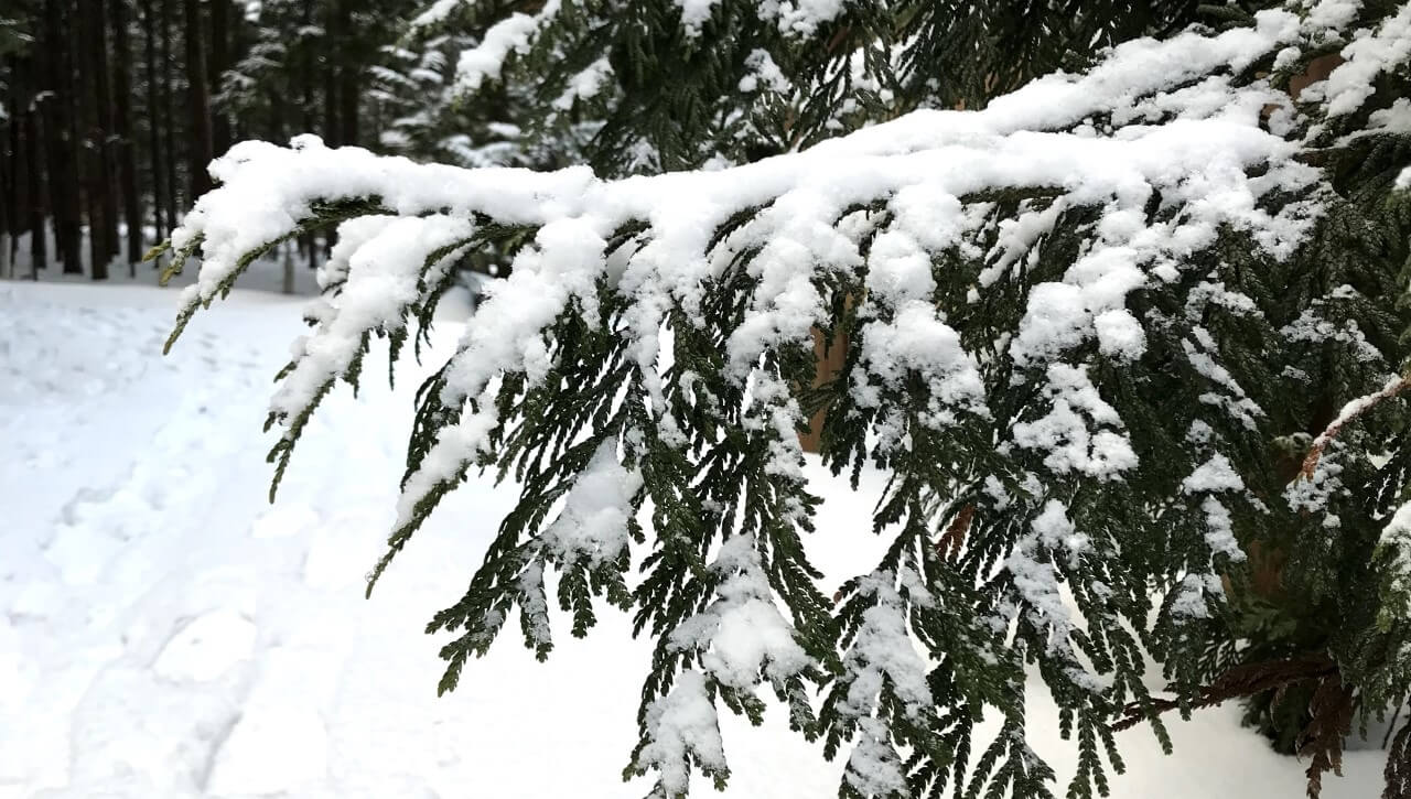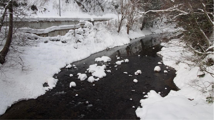 ヒバやブナといった樹木の葉には雪の花が咲き、道路はさながら雪のトンネル。途中、渓流沿いに車を停めれば、川の中に点在する石に雪がこんもりと積もり、その間を清冽な川の水がサラサラと流れる様は水墨画のようだ。