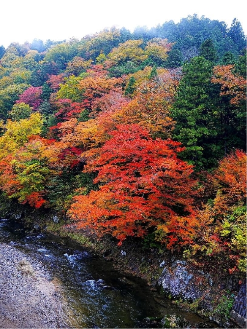 ハウチワカエデやヤマモミジといった赤く色づくカエデ類が多いのがその特色で、緑・黄・赤の競演が素晴らしい。