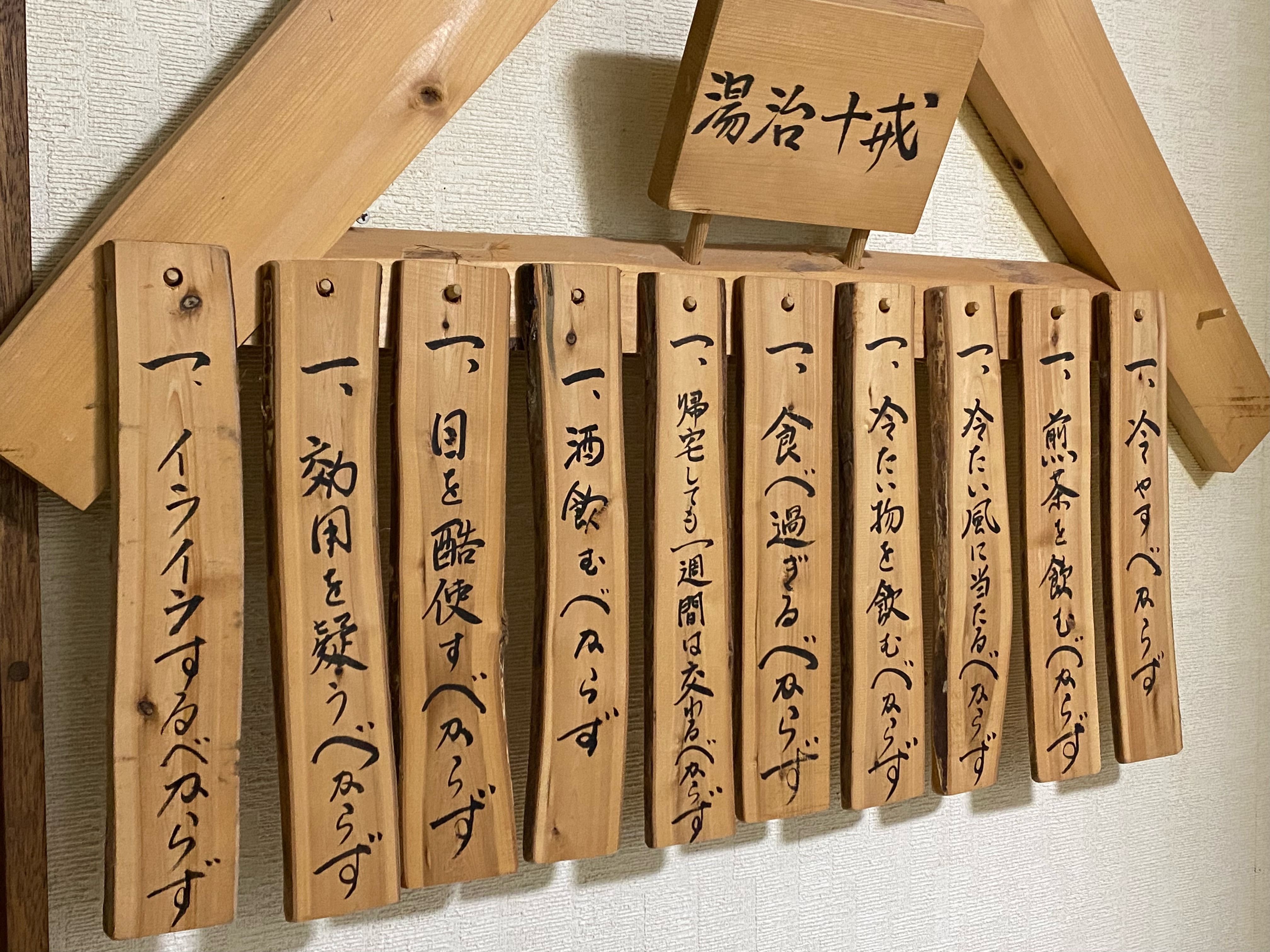 湯治は療養の様なもの、入院する位の気持ちじゃないとダメなんだ。今の「遊び湯治」じゃ治るものも治らないと、母が良く言っていました。数年前、TV取材が入った時にその話をしたら、色々ある注意事項を書きだしたら面白いという話になり、「湯治十戒」ができました。