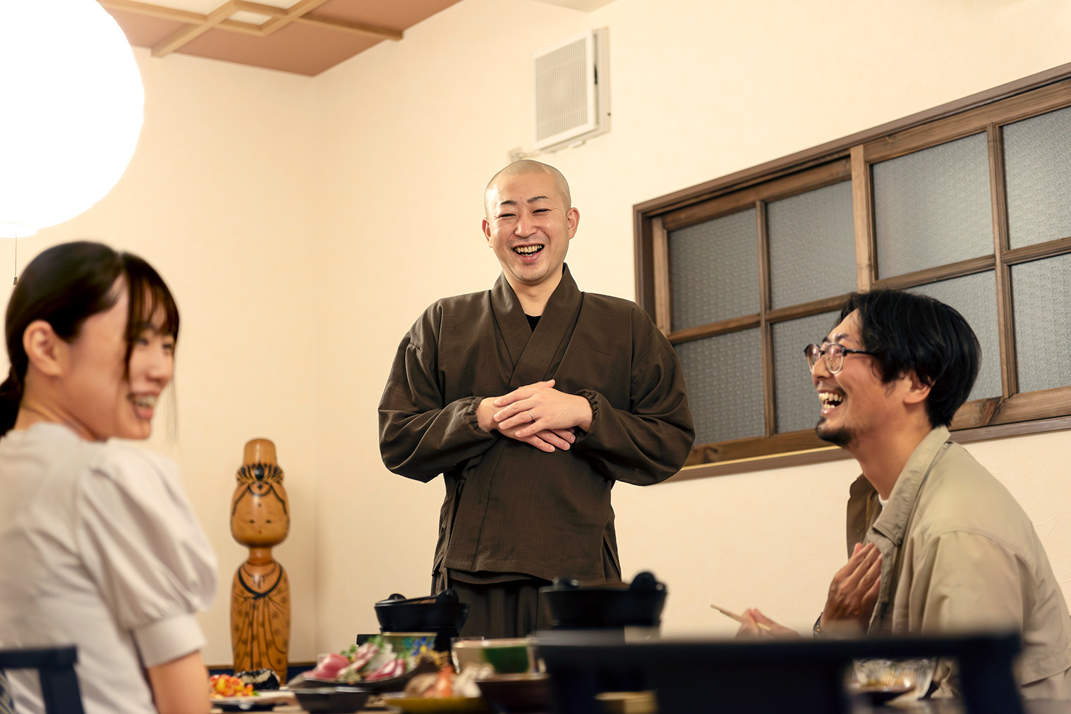 出会いの縁を結ぶ思いを込めた「おむすび御膳」を食べ終え、昨夜の話の続きに花を咲かせていると、あっという間にチェックアウトの時間を迎えていた。本当は写経にも興味があったし、境内をのんびり散策もしてみたかった。次こそは体験を!と思ったけども、次に来るときも話に夢中になってしまいそうな気がする。心をほぐして時を忘れさせてくれる、この体験は泊まるから味わえる寺の癒やしだ。