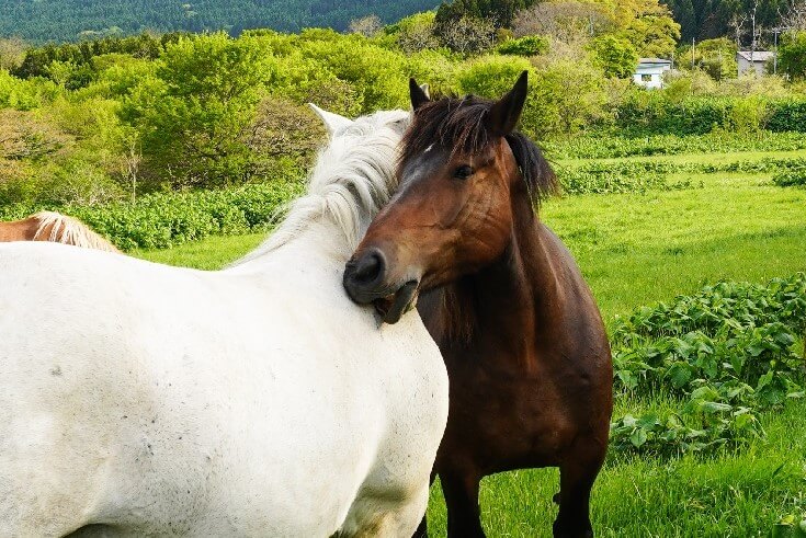 馬が互いに首を寄せ合い、相手の体に口を近づけているのがグルーミング(毛繕い)。よく見ると口元の柔らかいところで、やさしく相手を噛んでいます。グルーミングには、ダニなどを取る、毛の束をほぐす、古い皮膚をはがして血行を良くするといった効果があるといわれ、その様子からは、馬の親密度もわかります。