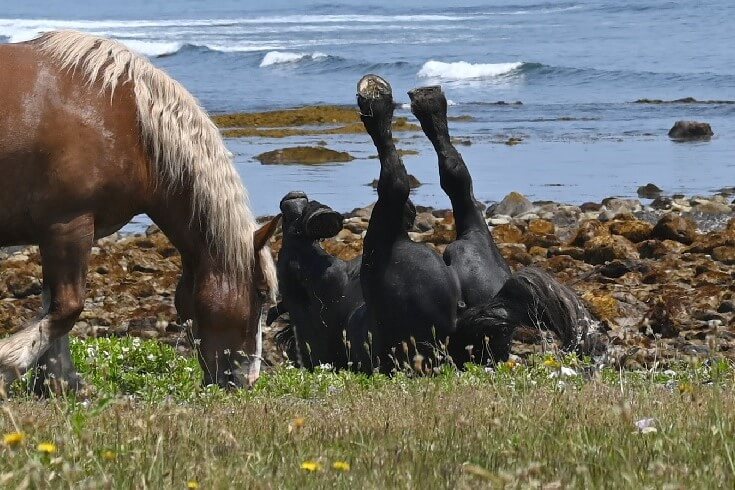 筆者はここを訪れる前、寒立馬を管理する東通村農林畜産課に、馬の行動から分かる心理状態などをお聞きしていました。村によると、わかりやすく、注目すべきは耳とのこと。危険を察知した時、両耳はピンと立ちます。見学者がいても、無関心に草を食んでいるように見えますが、耳を見てみてください。きっとピンと立ったままのはずです。実は警戒しているのです。特に、仔馬を守ろうとする母馬はそれが顕著です。
