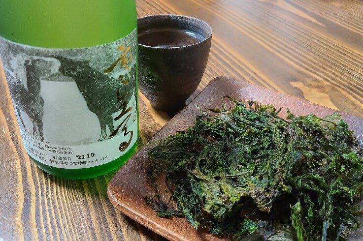 岩のりを買いました、と次回このコーナーを担当する『青森の暮らし』の下池康一編集長に伝えたところ、フライパンで炒って、塩をちょっと振りかけて食べるのもおすすめと教えてくださいました。早速、これを肴にむつ市の関乃井酒造の日本酒「寒立馬」を一献。あー、旨い! 寒立馬たちの姿を思い浮かべながら、心地よく酔いました。
