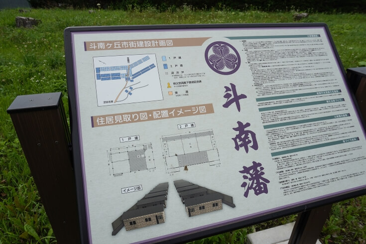 斗南藩は政策として、丘陵地帯を開拓し、街を建設しようとしました。街は、一番町から六番町までの大通りによって屋敷割をし、東西には門を配置、1戸建約30棟、2戸建約80棟、深井戸18か所などが建設されました。現在もこの場所には、井戸跡や土塀跡が残されています。