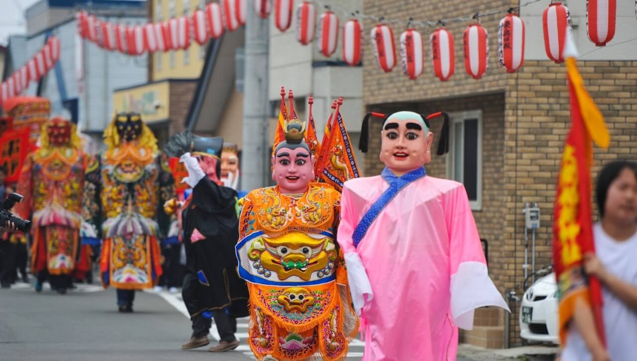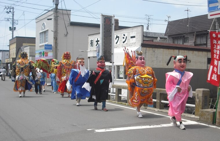 さらに翌年、大間稲荷神社と台湾の総本山・北港朝天宮が姉妹宮となり、行列では、北港朝天宮から寄贈された「本尊分身」「千里眼」「順風耳」などの人形が町内を練り歩くようになりました。また、大きな銅鑼の音や爆竹が異国の風情をさらに深めています。このように、天妃様行列の実施は、台湾と大間との交流の機会をもたらしました。