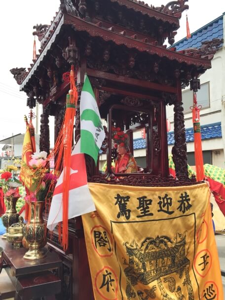 台湾での天妃様行列は「媽祖巡礼」と呼ばれており、台湾最大規模の祭礼です。お神輿を担いだ巡礼の列は、9日間に渡り330キロメートルを歩きます。信者たちはそれぞれ参加できる部分を巡礼し、その数はのべ100万人以上といわれます。