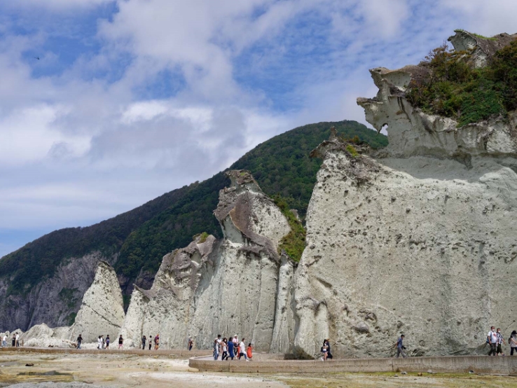新第三紀(2,303万~258万年前)の海底火山によって緑色凝灰岩が層として堆積し、さらにそれが隆起して地上に露出した後、雨水や波浪、凍結といった浸食作用を経て形成されました。現在も浸食作用によって形が変わり続けており、極端に言うと、今ある姿は今しか見ることができないんです。