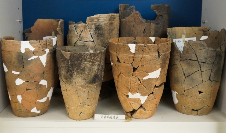 考古の資料は、もともと教室だった1フロアに、旧石器時代に始まり、縄文、弥生、平安時代までの土器が並べられています。中でも、縄文時代は、草創期を除いた全時代(早期、前期、中期、後期、晩期)の土器を順に見ることができ、約6,000年間にわたる変化の様子がわかります。