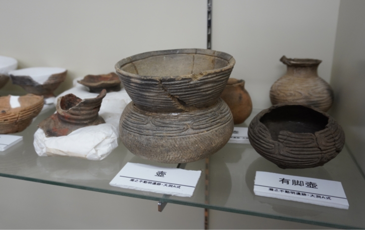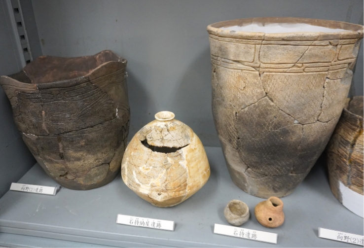 そして後期(約4,000年前)へ。ここには、石持納屋遺跡の壺形の土器や、向野(2)遺跡の土器が展示されています。東北地方南部の縄文文化が北上した影響を受け、紋様が複雑化してきています。