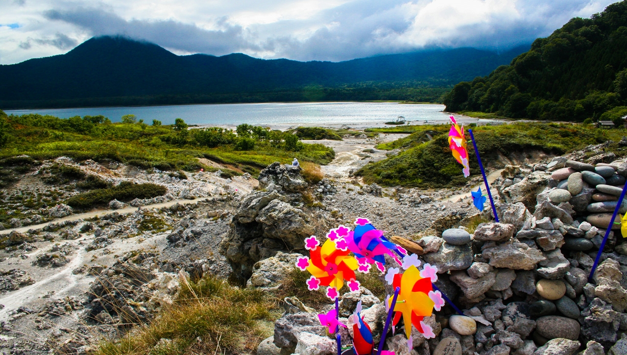 霊場恐山のごつごつとした岩場から立ち上る白い煙、カラカラとまわる風車。あたり一帯には硫黄の臭いが漂います。人はここを地獄と見立て、逆に湖面美しい宇曽利山湖とそれをとりまく白砂の浜を極楽浄土と見立てました。