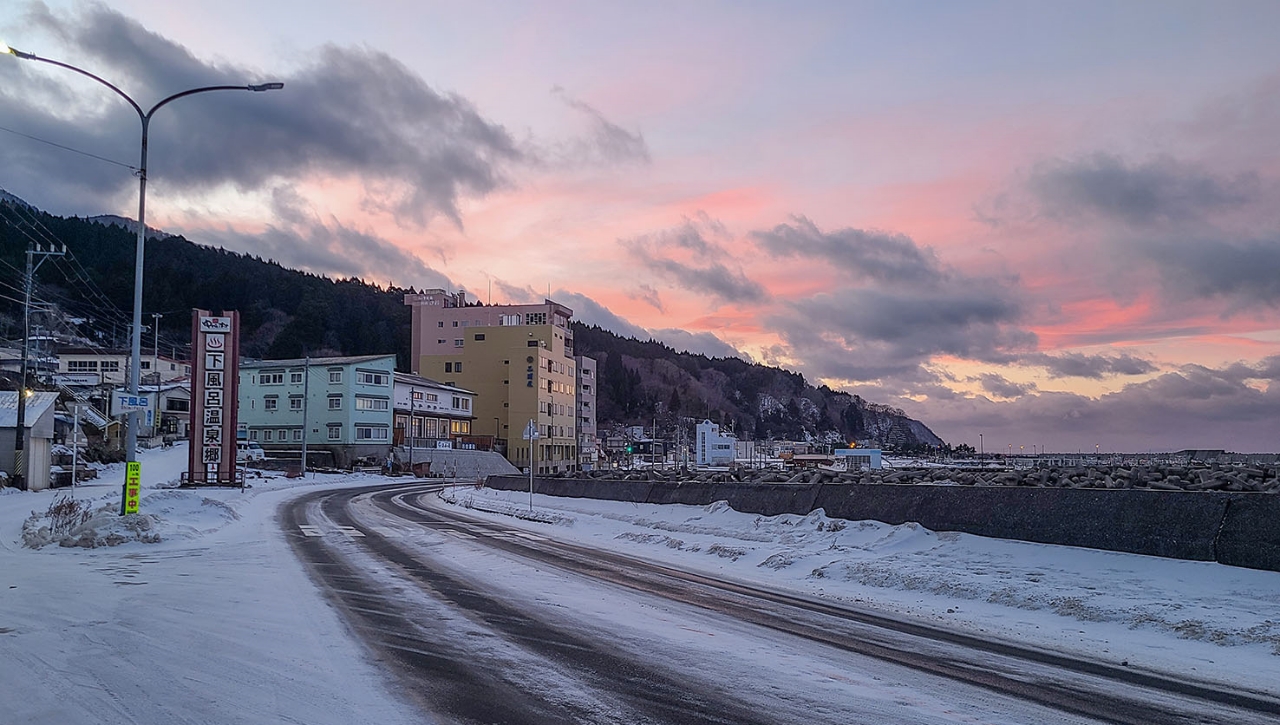 下風呂温泉郷の入り口にさしかかり、夕景を撮影しようと車を降りてみると、顔にびゅん!と寒風が。一瞬で体が冷えこみます。震える指先でシャッターをきりながら、「早く、温泉に行ってあたたまろう」と再び車に乗り込みました。