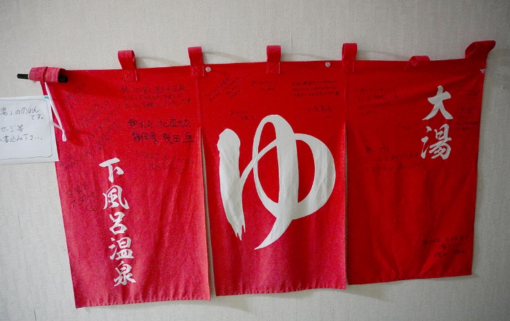 大湯と新湯、2つの共同浴場は、残念ながら施設の老朽化から、2020年の冬に惜しまれながら閉館しました。まるほん旅館には、大湯共同浴場で使っていた赤いのれんが飾られていました。閉館を惜しむファンの寄せ書きに胸がじんと熱くなりました。