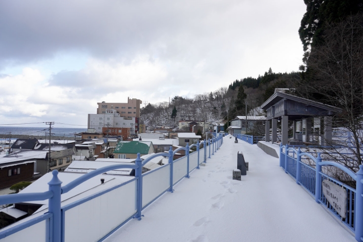 下風呂の鉄道アーチ橋は、メモリアルロードとして整備され、駅のホームをイメージした小さな建物に足湯スペースが設置されています。私が訪れた時は、足湯は冬場でお休み中でしたが、今度来た時には、津軽海峡を眺めながらゆっくり足湯を楽んでみたいと思いました。(こちらの源泉は浜湯です) ※足湯は冬季間閉鎖