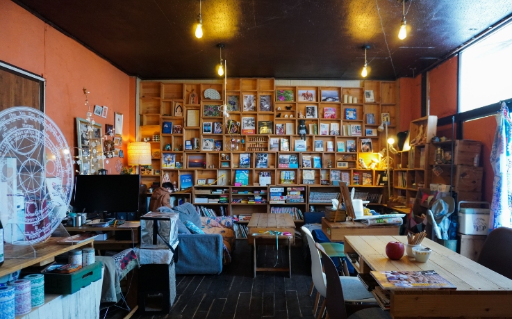 リンゴ箱などを使った壁一面の本棚が洒落ている店内。「たらこさん」の愛称で親しまれる店主の古川美香さんがいれてくれる挽きたてのコーヒーを飲みながら、ゆっくり読書をしたり、ボードゲームを楽める空間です。