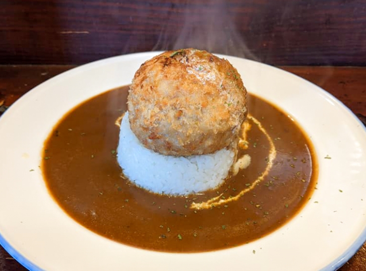 横浜町を出て、仏ヶ浦へと進路をとる。途中、「アランドロンカレー」なるメニューがあるという、むつ市大湊の「美味小屋 蛮」で早めの昼食をとる。出てきたカレーを見ると、ルーの真ん中に、小島のように盛られたご飯と、げんこつのようなハンバーグが。これだけでもインパクト大だが、ハンバーグにナイフを入れると「あらん♡ドロ~ン」とチーズがあふれ出す。なるほど、だから「アランドロンカレー」なのか。うまい。