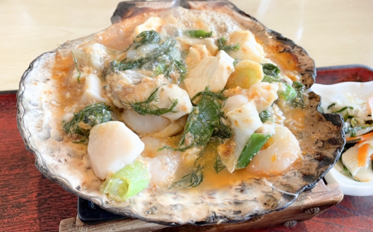 朝からよく歩いたので、すっかり空腹だ。むつ市内の「お食事処 なか川」で昼食をとる。ホタテ定食も捨てがたいが、やはりここは、みそ貝焼き定食だろう。ホタテの貝殻を器に、ホタテの身、エビ、豆腐など具材も豊富だ。具材の上に載っている卵をとき、ぐつぐつと煮えていく様をじっと見つめる。
