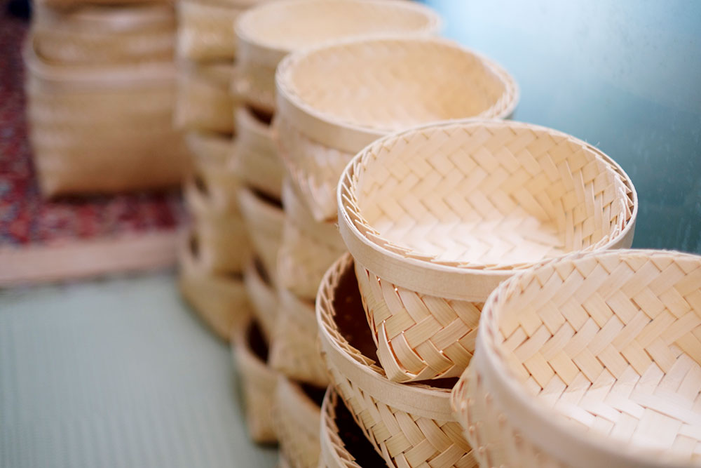 柴田さんは、このヒバを製材するときに出る端材を、薄いテープ状に加工し、一つ一つ丁寧に編み込み、かごを作り出している。柴田さんのヒバかごは、下北だけでなく、東京でも販売され、多くの方に支持されている。近年では、パリで行われた展示会にも出品され、今や世界に羽ばたく工芸品だ。