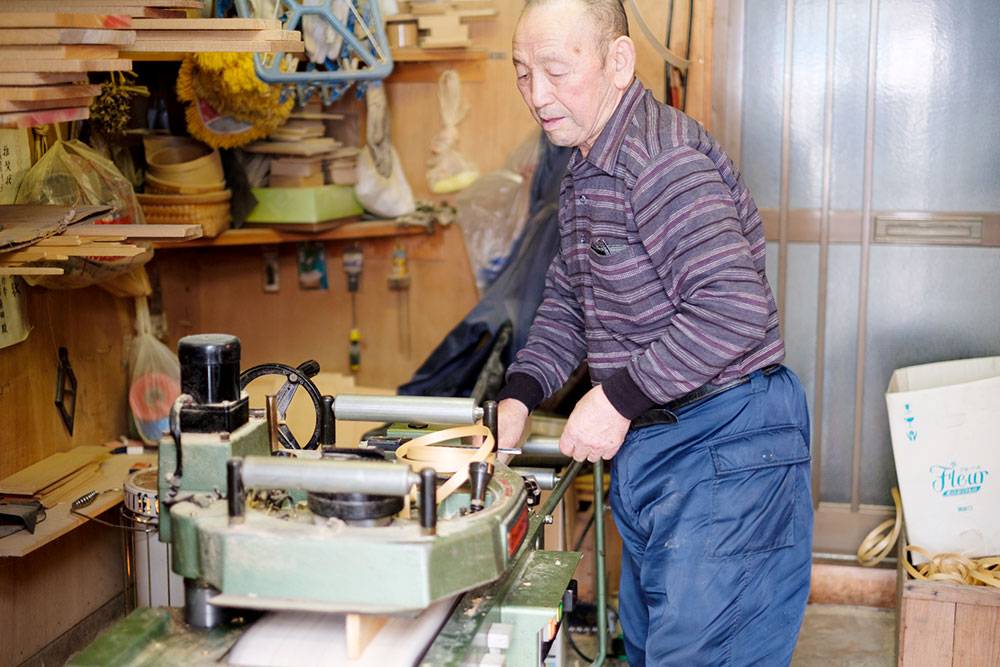 まずは材料となるヒバのテープを作る作業場。板を電動のカンナで薄くスライスしていく。編むかごの大きさによって、幅や厚さを調節する。その精度は100分の1ミリ単位だ。スライスしてできたヒバのテープは、しなやかだが丈夫で、曲げることもできる。