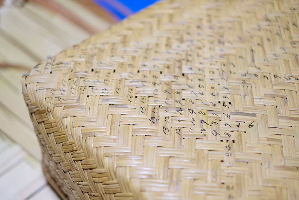 と出してくれたのは、竹でできた行李(衣装などを入れるかご)。よく見ると、数字が書いてある。これは、柴田さんが行李を見て、どのように編まれているか研究した跡だ。行李を参考にしながら、独学で現在のヒバかごを生み出した。