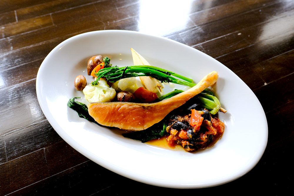 竹川さんによる下北の食材を活かした料理の代表作、「海峡サーモンのミ・キュイ 温野菜ぞえ」をいただいた。ミ・キュイは、フランス語で「半分火が通っている」という意味。絶妙な火加減により、生のなめらかな味わいと焼いた香りの両方が楽しめる料理だ。