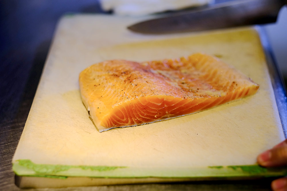 「海峡サーモンは、むつ市大畑町で育てられているサーモン。生で食べることができるので、この料理にはとても合っています。海峡サーモンは、生産者さんと10年以上付き合っていますが、非常にクオリティが高いサーモンですね。うちでは、その中でも貴重な5,6㎏クラスのサーモンを使わせてもらっているんです」